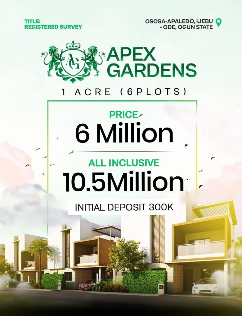 Are you searching for affordable land for sale in Ijebu-Ode? Look no further than Apex Gardens, a prime, high-value estate strategically located at Ososa-Apalado, Ijebu-Ode, Ogun State. This offers a golden opportunity to secure premium plots of land in Nigeria with a clean and verified title: Registered Survey.
