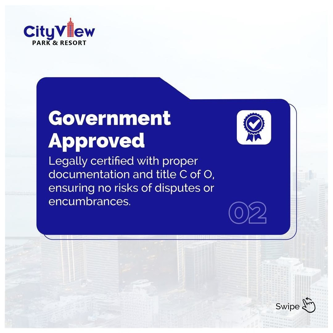 City View Park & Resort offers flexible options for both residential and commercial buyers. All plots come with attractive payment plans, including outright purchase, 0-3 months, 6 months, 12 months, 18 months, and 24 months installments. Initial deposits start low to make ownership accessible.