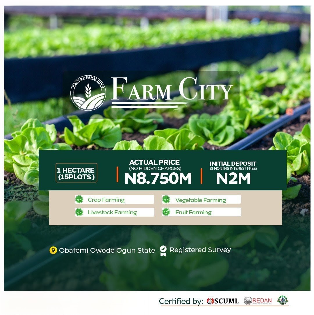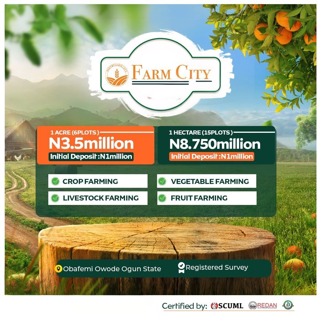 Welcome to Farm City, Orisunmibare, Obafemi Owode, Ogun State — a one-of-a-kind agricultural investment opportunity designed to promote food security and sustainable farming in Nigeria.