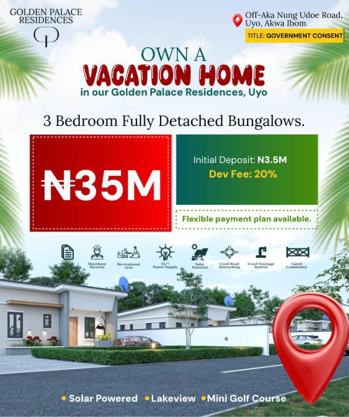 Golden Palace Residences sits off Aka Nung Udoe Road in Uyo. The estate delivers a peaceful lifestyle with maximum security and steady power. Every home is designed for buyers who want luxury living in a gated community with modern infrastructure.