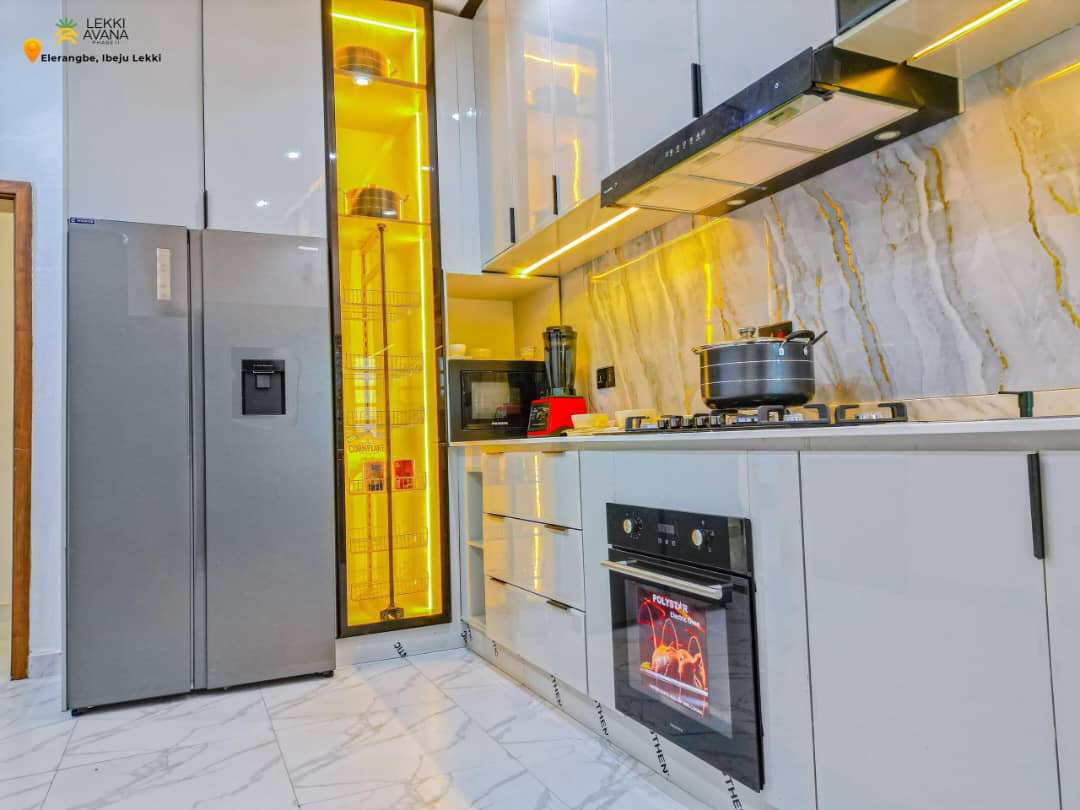Tastefully Designed and furnished kitchen at Avana Phase 2 Estate Lekki LagosModern Kitchen Modern Kitchen equipped with double door fridge, dishwasher, glass cooker, heat extractor and more around Lekki Avana Phase 2 Estate