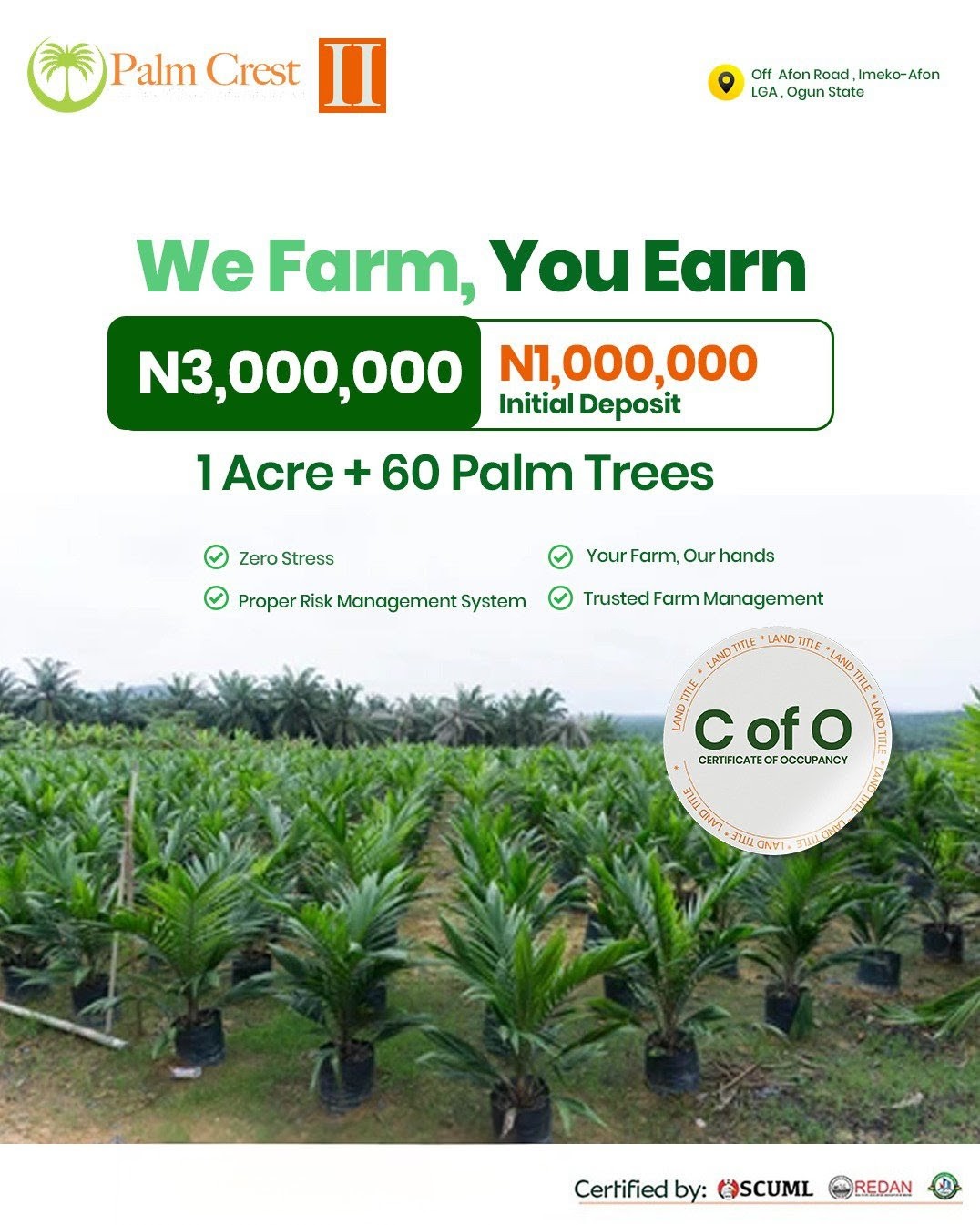 Palm Crest II investment in Ogun State. 1 Hectare Agric Investment in Ogun State