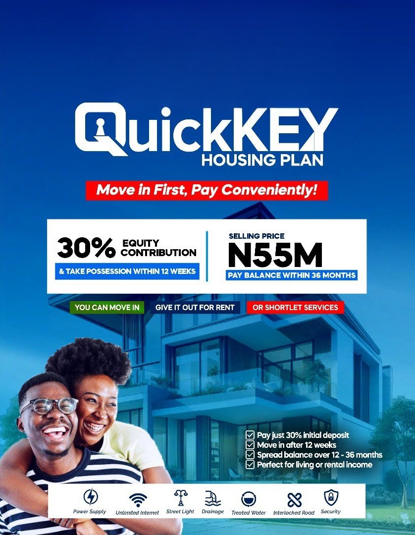 Quick Key Housing offer gives aspiring homeowners a fast, affordable route to a modern 3-bedroom detached bungalow for ₦55,000,000. With a low 30% deposit and keys delivered in just 12 weeks, this program is ideal for buyers searching for affordable property for sale in Nigeria or houses for sale in Nigeria who want speedy occupancy or rental income