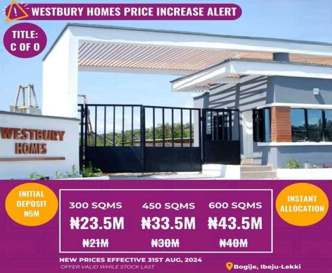 This is your chance to own a valuable plot in one of the fastest growing areas in Lagos. Secure your plot at Westbury Homes now before prices increase again.